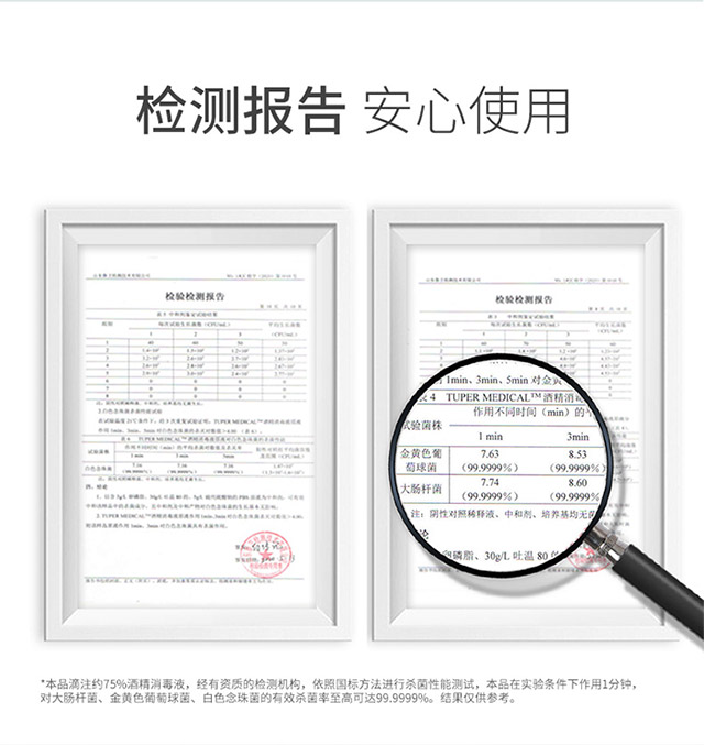 2、酒精濕巾、酒精消毒液 檢測(cè)報(bào)告證明殺菌率99.9999%*